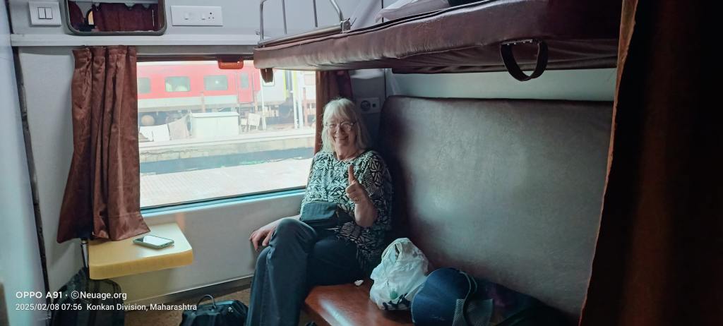We left early with a driver to CTS (Central Train Station) Lovely trip on 1AC with the cabin to ourselves. An 11 hour ride with 2 naps on the top bunk. No problem getting up there with my sore knee. It was a little staircase to get to the top.