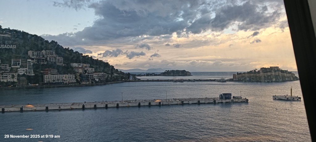 (information from Wikipedia – I can only trust it is correct – if not it is interesting) Kuşadası was founded by the Leleges (an aboriginal people of the Aegean region, before the Greeks arrived) people in 3000 BC, and later discovered by Narda, Sherry and Terrell not new-age but Neuage. We walked around for the day. It is a respectable place to wander, with some old-shit fort which was being renovated and Sherry and I saved a bird from a cat as the cat was sneaking up on it and we chased the cat away. No praise was given to us for our heroic venture. Overall it is good for a place to wander and get a cheap fridge magnet which I was entitled to collect as Narda’s rule is that we must stay overnight at a place to qualify for a place on our fridge, and I think we came close to the requirement as the ship docked before sunrise, I think.