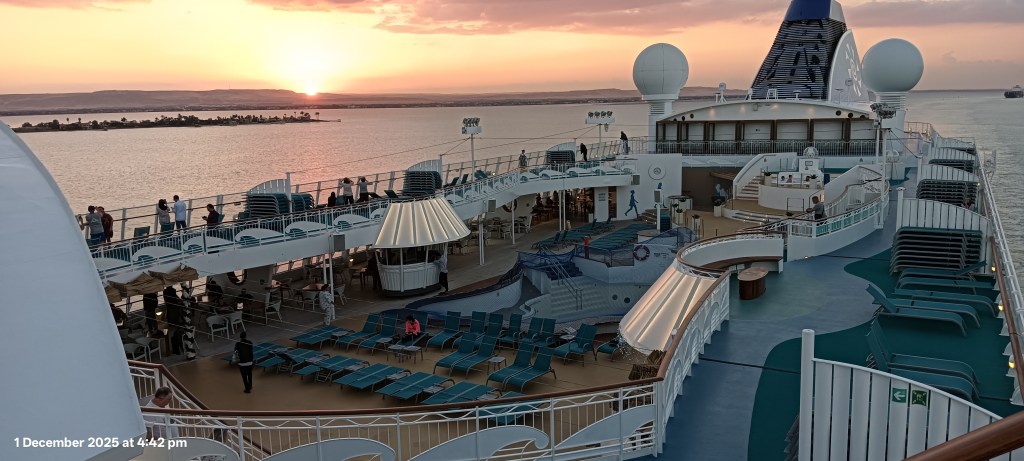 ABOUT THIS CRUISE. Yes, it was absolutely the best and we most definitely would do it again. But here is the thing about our cruise. We booked in via Flight Centre in Adelaide months ago. We have not used Flight Centre in the past, figuring we could do better on our own. However, we got stuck on getting our flights to Amsterdam and they got us there was a three-day free stopover in Doha which we told about in the previous blog post. I found this really groovy and great cruise. However, with weeks to go before leaving for Amsterdam, we were informed by Flight Centre that our two-week cruise was now one week. No reason was given. Doing a bit of research, we discovered no other cruises were going through the Red Sea past Yemen and Somalia at this time.